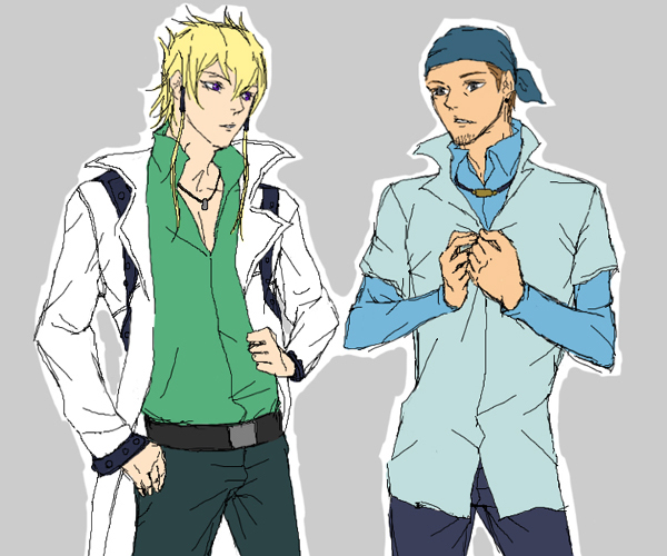 あれ?なんか今日二人とも、いつもと違くね・・・?そう思いつつみんな「まいっか」って気付かないといい、ただなんかジャックが優しそうでナーヴが冷たそうに見えたり、みたいな。ジャックの昔の服こんなでいいんかな・・・コスチェンナージャ、ズボンも交換したよv 一緒に暮らしてりゃ服くらい入れ替わりますというカプ論、構図にひねりがなくても一緒にいると似てくるんdeathと・・・会話もナ「俺のピアス見てない?」ジャ「それなら枕の下にあったからテーブルに置いておいたぞ」ナ「マジで?Thanks.」ってカンジでvv(もうそこまでイッてる)By the way,ナーヴってピアスしてんの??(未確認)素敵サイト様の影響でもうしてるもんだと・・・今度確認しよう、してなくても描くし★そして何歳なの・・・シワ確認したし(イタ兄は子供の頃からシワ!!爆)、タカとブリッツも言われてみれば年いってるように見える気もするけど・・・ジャックと同い年くらいがいいな~遊星とつるんでるんだからそれくらいだと思うけど(「レオリオも19だから大丈夫」by妹)。背もジャックくらいあるといいな~ジャックが社長並で185あるとして小さくても183はあるといいな~でかいでかい白人カポーお前ら国どこだー・・・まだ序の口です、妹に日々「早くがくとハマッちまえよ(聴きたいから)」と言われながらも二人のことを語っている上、そうして口に出すのも頭の中の萌え全部じゃないので、日記に書くのはほんの一部です@(腐)はぁ・・・そろそろ更新できそう、したら遊戯王サーチ登録しよう、その前に忙しそうOTL