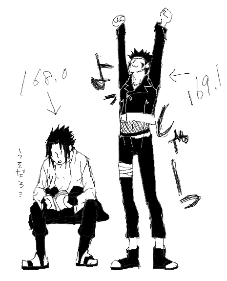 うそだろって私が思った、よっしゃーとも私が叫んだ★名前の順て素晴らしいよね・・・シノ君の大きさ見てからだったからなんか嬉しかった(シノキバぢゃないけど)、160センチ代・・・(あと9ミリだけど)。この微妙な身長差が昔からキバサスの魅力です・・・闘の書の時点ではサスケが順調に追い越してると思ったのになぁ・・・オロ茶栄養のあるもん食わせろよ!あ、音の里って・・・(心底残念そう/爆)。でもでも、同体格組(?)だったシカマルが170になって(十の位が変わるとなんか大分違う気がする・・・@/まだ同程度)、こいつらより下はナルト我愛羅(ついでにデイダラ/笑)だし、ここらへんなんか凄い特別な感じがして嬉しい★(被害妄想)体重も300グラムしか変わらないし!やっぱ忍びの世界って軽いよなー、50キロちょっととかマジで担がせろvv