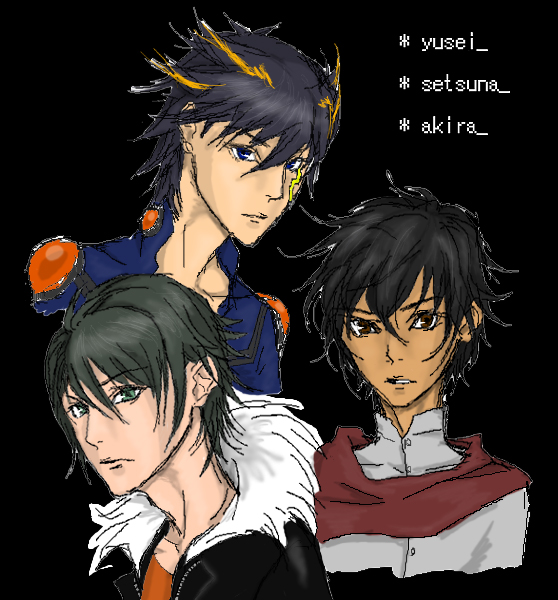 やっとオリジの幕が下りたというか皮が切れたというか・・・!これだけでも・・・って絵を描き終わりました、っつーか終わらせた、もういいやこれっつんで・・・(Re雪村)。こんなカタチでウチのコ達を公開できる日が来るなんて・・・ちょっと実感沸かなくて吐息が震えてるんですが・・・@これからどんどん、とまではいかないだろうから(爆)、ちょびちょび描いていきます・・・vv まずは名前と顔だけ明かしとこう、落ち着いたら少しずつメインキャラからプロフィールを・・・OTL(辛く長く難しく楽しい道のり)