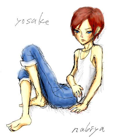 つーかヨースケさんしか指定できねーよーなことになっててごめんなさい!!(殴)これの次にあった『創作語りバトン』もそのうち答えたい・・・!おかげでオリジも頑張らねば、と気合が入りました☆つまらないバトンになりましたねー・・・OTL 性格とか、私から~なのが多いので、子供時代もほぼ私がモデル@目に見えないモノに怯えてるような・・・そんな子供。あまり笑わないけど人見知りってわけじゃなくて、一人遊びが好きなのに寂しがりやで・・・。カッターナイフ踏んでかかとに刺さっても、慌てず騒がず抜いて止血するような子供@(いらない実話)ヨースケさんの子供の頃は考えてなかったけど、30代後半のヨースケさんは髪クリーム色なのになぜ赤毛なのか・・・十代後半のヨースケさんが赤毛だったから~@なに、劣化?(色)髪型も十代参考。目だって今青じゃないけど、赤毛に青というなさそうな感じのチョイス@ヨースケさん十代の頃、結構吊り目だった!今は加齢のせいか目尻が下がってきたけど・・・(そういう設定?)。