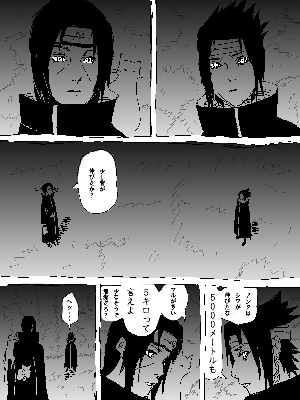 これは訃報の前に描いたヤツだけど・・・私にはこんな姿が焼き付いてるんだからな(爆)、コミックで最期拝むまでは・・・でも多分数ヶ月でこの兄が脳内に帰ってくる@字が読めなかったらクリックして別窓で原寸で見てやってください。妹よ、ネタさんきゅ(パクリ)。でも妹が一番ウケてたのはイタ兄の肩の・・・わーい共演共演・・・うっorz(涙)見ながらだけど適当に描いてみて、結構NARUTOの絵柄と違ってて安心した、もっと影響受けてると思ってた。でも最近、最遊記とリボーンとBLアニメの見過ぎで絵柄が少女マンガチックになってきた気がする@